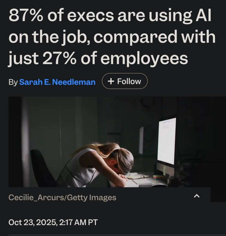 A major new study shows a huge AI divide at work. Eighty seven percent of executives use AI on the job, compared with fifty seven percent of managers and just twenty seven percent of employees. Execs even use AI more than Gen Z.